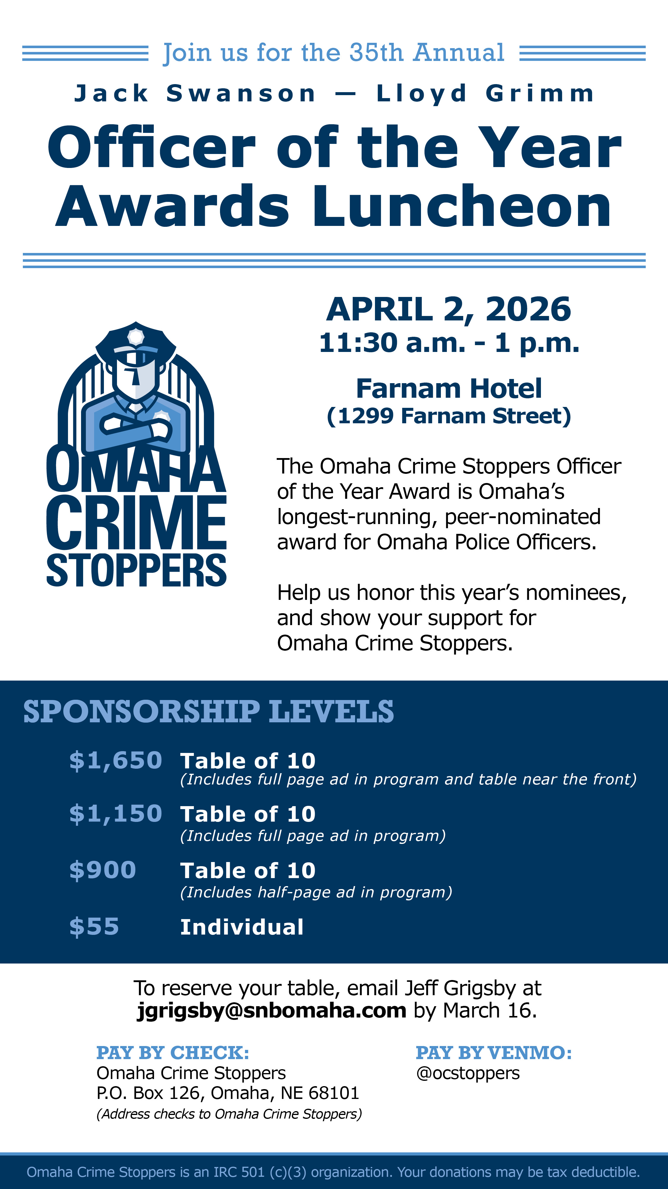 Crime Stoppers sponsors Omaha's longest-running, peer-nominated award for the Officer of the Year.